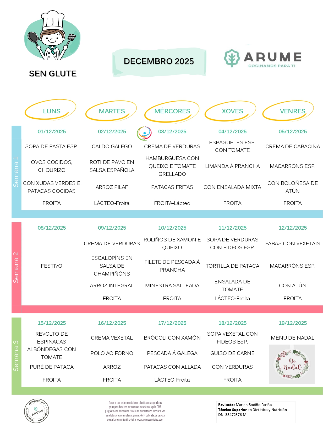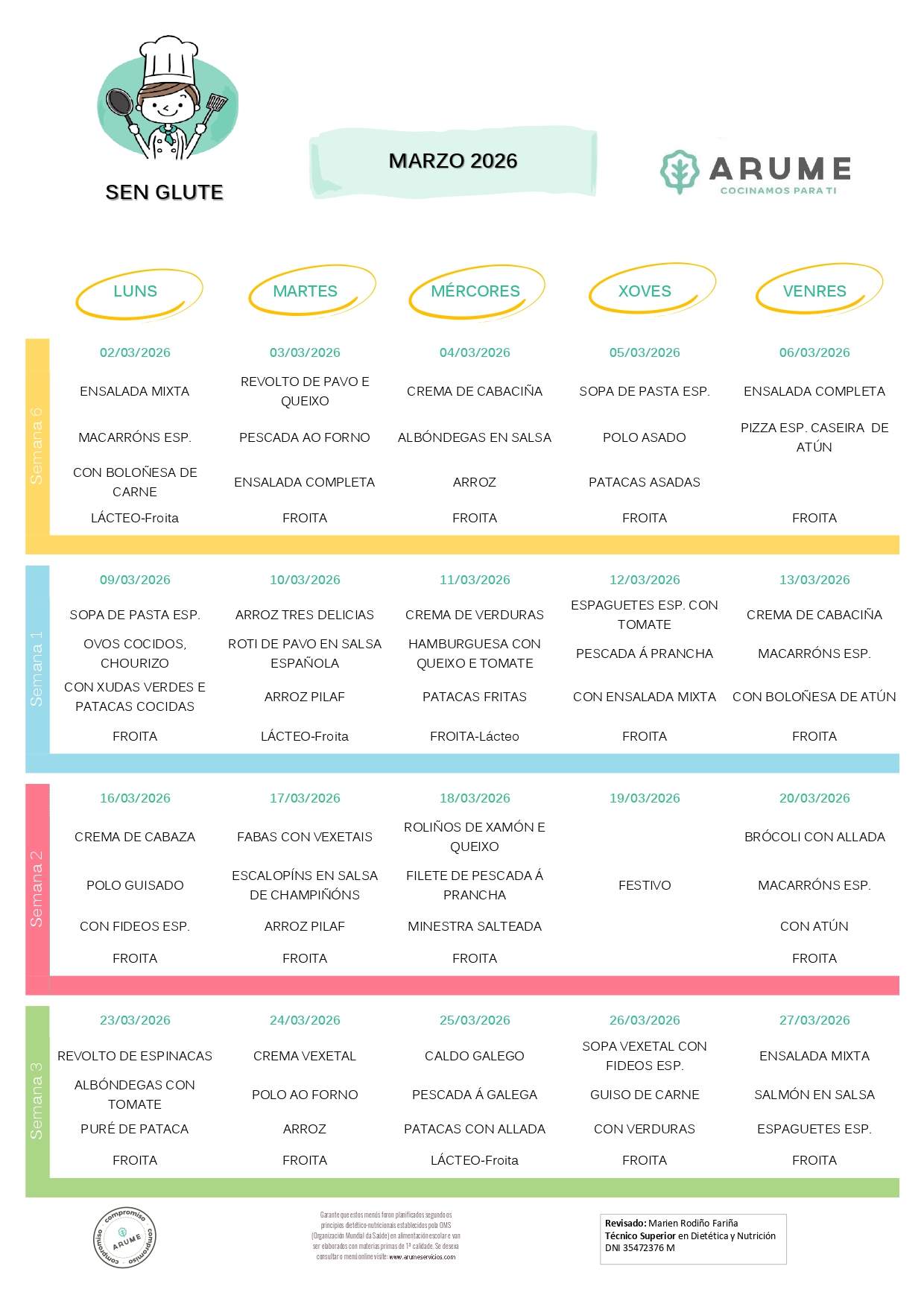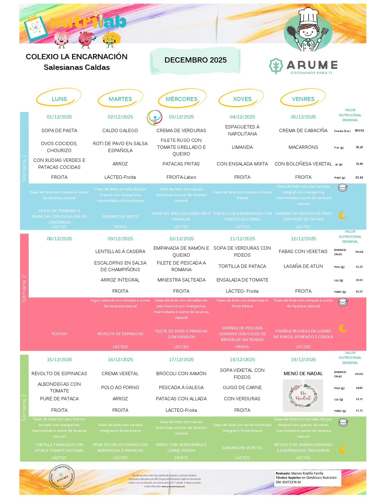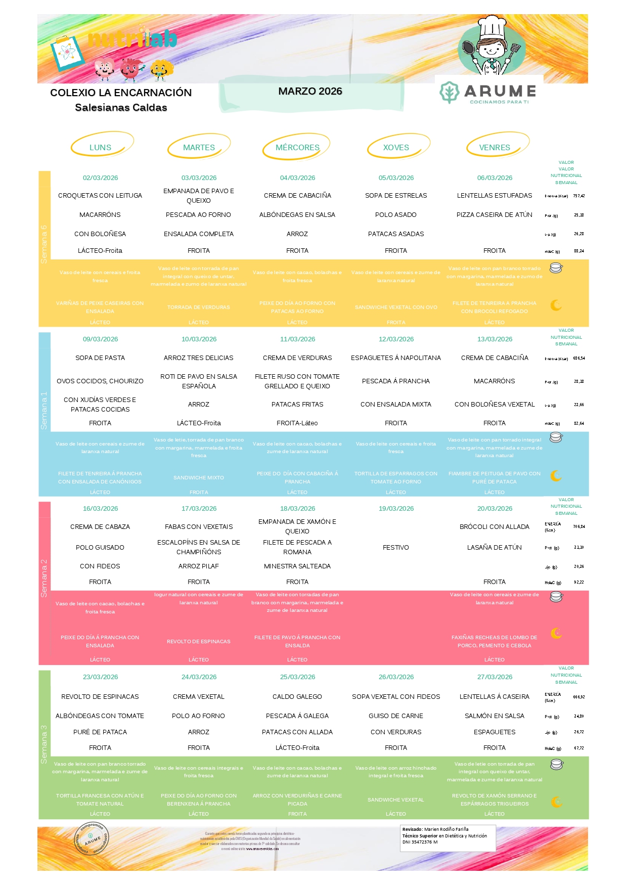 El servicio de comedor está gestionado por la empresa ARUME. Cada día, la comida es elaborada en el centro utilizando productos variados y de calidad. El menú es confeccionado por el departamento de nutrición de la empresa y revisado por el propio centro.